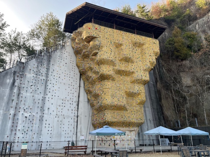 巨大なクライミングウォールは見応えあり。実際にトライされている方がいました!