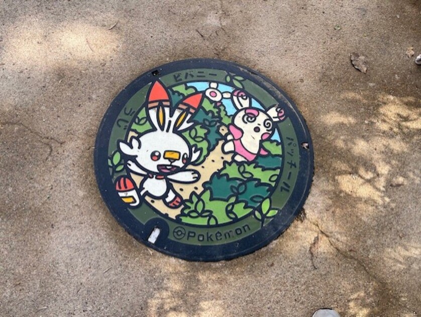 鳥居の前のベンチでひと休みしていると、足元のマンホールがなんと「ポケモン」のデザイン!海外の方やお子さんたちが興味津々でした。ポケモン人気はワールドワイド!